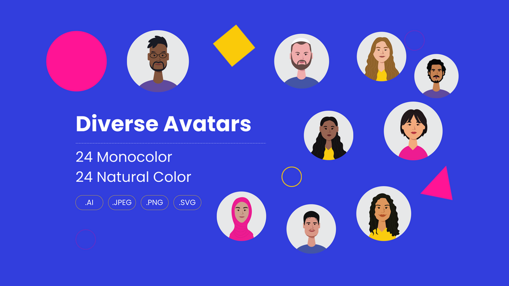 We are offering a unique and diverse set of people avatars in mono-color (that can be changed to any color) and in their natural skin tones. They are editable and can be customized for your web, mobile, and print design projects.
